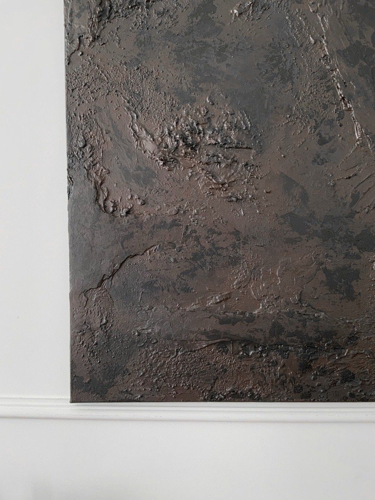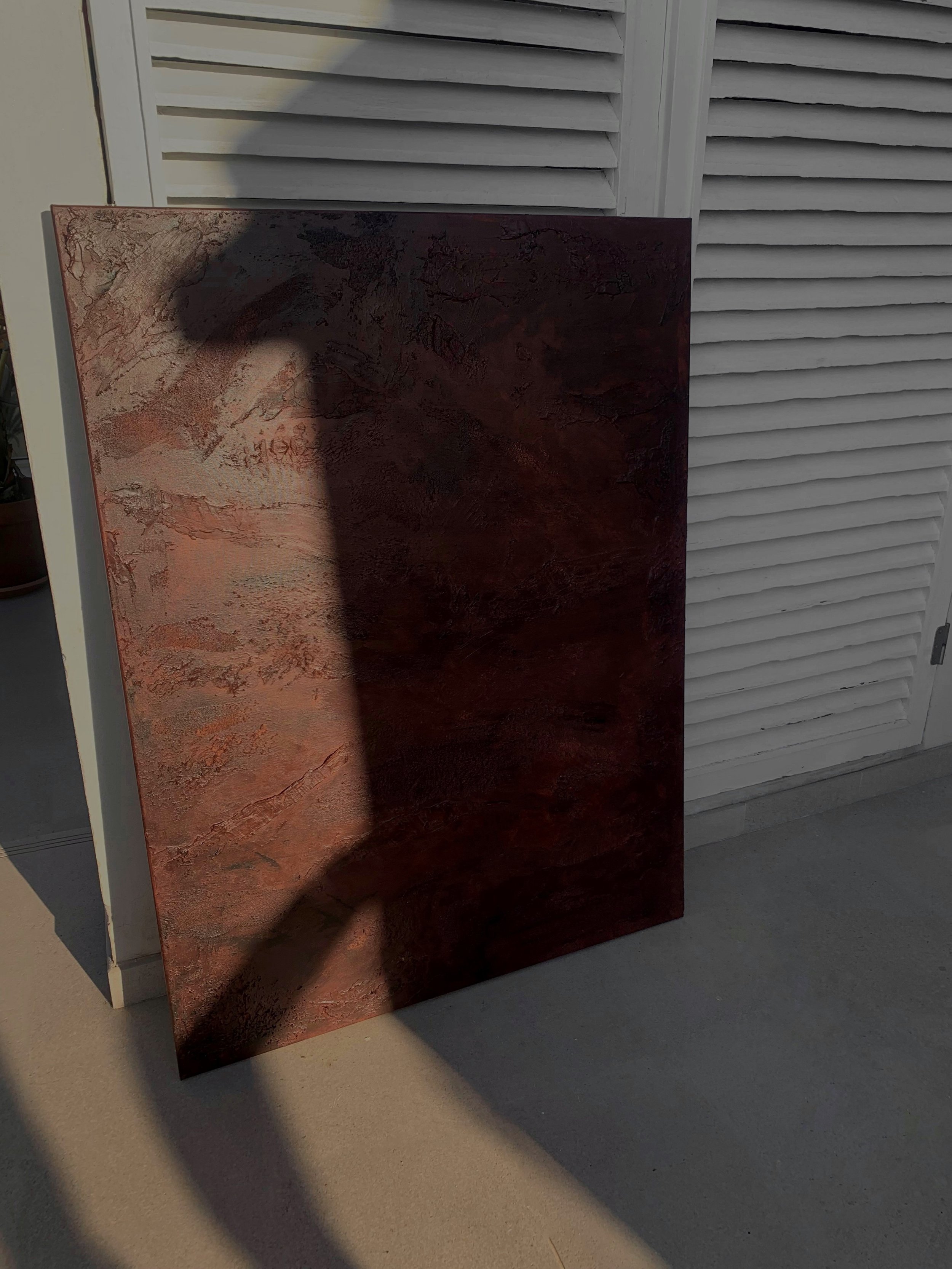 Trabajo principalmente con capas superpuestas de materiales que generan relieves orgánicos, permitiendo que la luz interactúe con la superficie y transforme la percepción de la obra según el entorno y el momento del día.